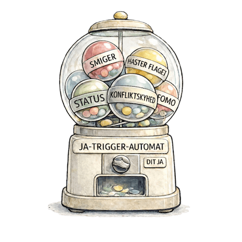 Kender du dine ja-triggere? Vi har dem alle. Smiger. Haster-flaget. Status. FOMO. Konfliktskyhed. Skriv dine to største ned på en papirlap og læg den på dit skrivebord.