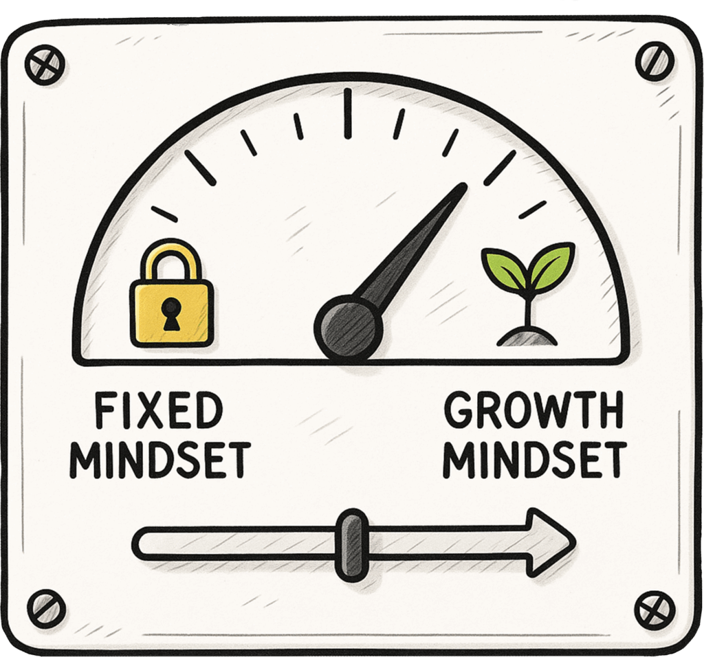 I løbet af din dag og uge bevæger du dig rundt på hele mindset-skalaen. Du kan sagtens have nogle favoritplaceringer. Men over tid vil dit mindset svinge mellem de to poler på mindset-skalaen.