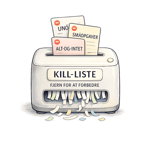 Så prioritér i stedet for optimér. Fjern for at forbedre – brug subtraktion som strategi. Og husk, prioritering handler om bevidste fravalg. Ikke fravær af bevidste valg.
